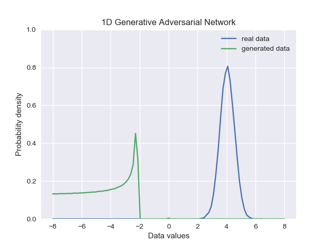 本实例训练一个简单的GAN,实现让噪声点分布逼近Ground Truth分布的功能,使用的是简单的一维数据点。初始数据分布如图: