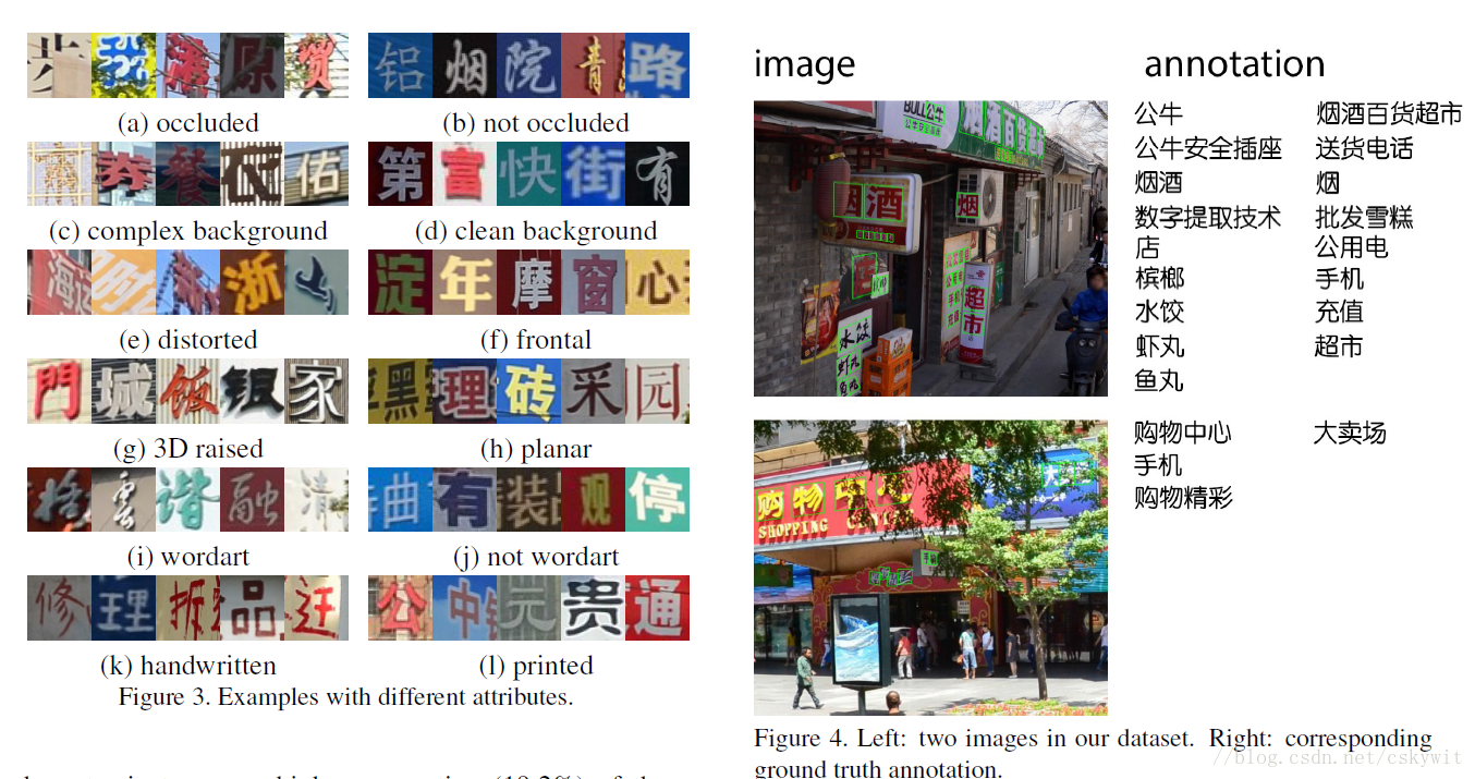 本文有腾讯AI研究院撰写,没有阐述什么创新的算法,最大的贡献在与构建了一个目前比较大的中文街景数据集,填补了在中文街景字符识别与检测方面的空白。该数据集有32285个图像,包含1018402个中文字符,分为3850个不同的汉字,有大、中、小三个尺寸,每个字符由bouding box和六个属性进行标注(planar text, raised text, text in cities, text in rural areas, text under poor illumination, distant text, partially occluded text)。
