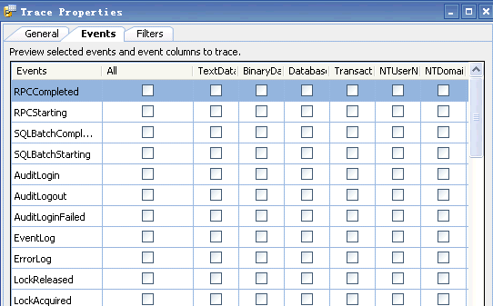 大概意思就是说 你想要监视哪些项就把哪些项勾选。比如我想监视单句执行的sql, 并且想看他执行的sql语句 跟 执行的用户 还有数据库