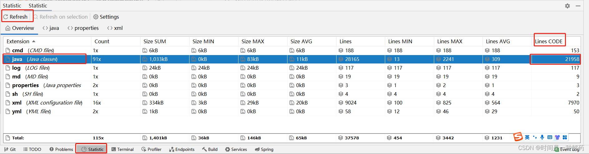 3 重启之后工具栏出现Statistic对话框,点击红框进行查看Lines CODE行数,这个项目我写了2W+行