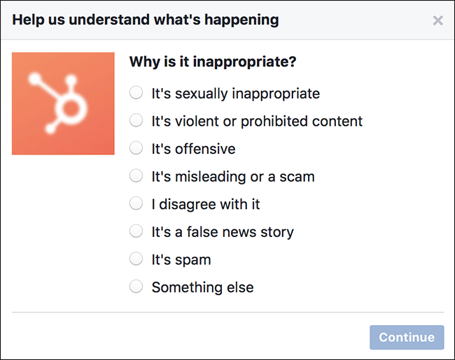 If you’re offended by the ad and want someone at Facebook to review it, select Report Ad and then select a reason it’s offensive. Click or tap Continue and it will be sent to Facebook for review as well as hidden from your News Feed.