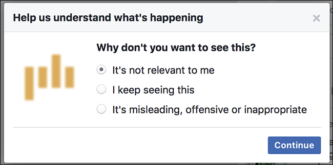 If you’re using the website, select one of the reasons you don’t want to see it and click Continue.