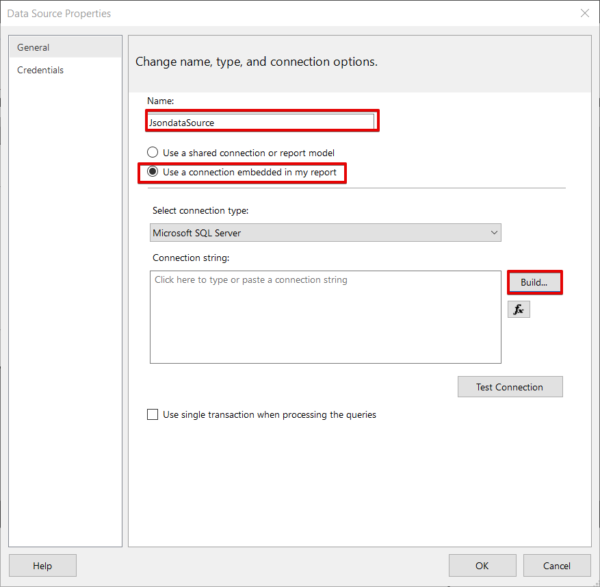 - Use a connection embedded in my report and then give a name to data source and then click 使用我的报表中嵌入的连接” ,然后为数据源命名,然后单击“ Build构建”。