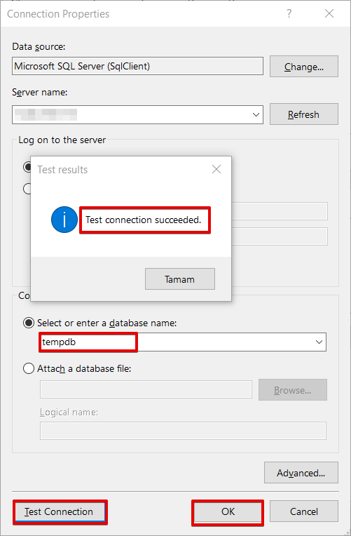 - In the Connection Properties screen, fill the server name and select the database. In this demonstration we don’t need to get any data from any database for this reason we can select tempdb 在“连接属性”屏幕中,填写服务器名称并选择数据库。 在此演示中,由于这个原因,我们不需要从任何数据库获取任何数据,因此我们可以选择tempdb。