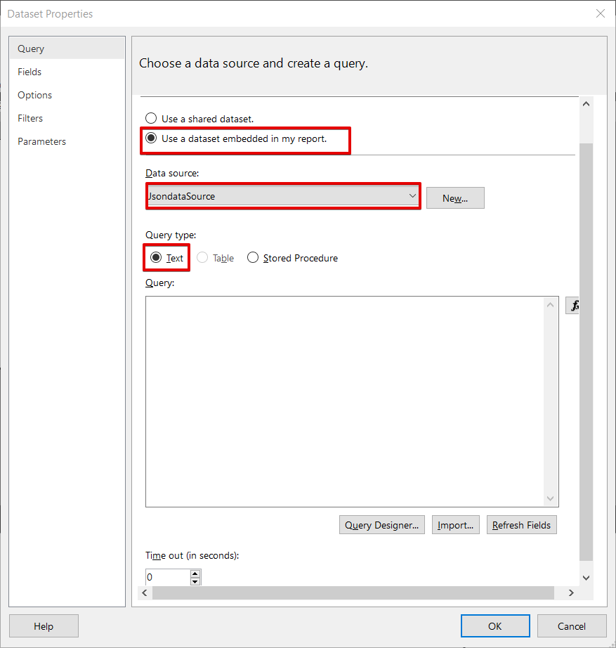 - Use a dataset embedded in my report and then select the data source which we created in the previous step使用嵌入在我的报告中的数据集 ,然后选择我们在上一步中创建的数据源