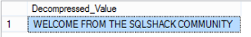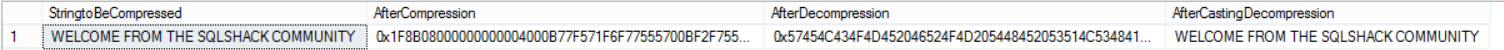 SELECT COMPRESS ('WELCOME FROM THE SQLSHACK COMMUNITY') AS Compressed_Value