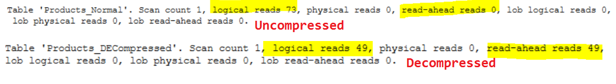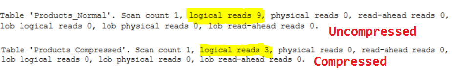 The IO statistics show us that the logical reads required to read the data from the compressed table is about 0.3 of the logical reads required to read from the original table: