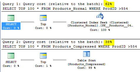 You can derive from the execution plans below that the weight of reading the compressed data is 38%, although it performed a table scan, compared to reading from the original table that consumes 62% of the overall load: