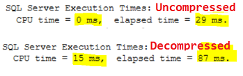 另外,您可以将其另存为表中的压缩数据,并在将其显示给最终用户之前即时对其进行解压缩。 但是,再也没有便宜了。 如果我们在读取原始数据和读取强制转换的解压缩数据之间进行比较,这将返回相同的结果: