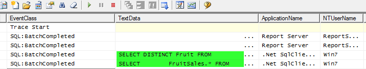 To demonstrate this point, I set up a database trace prior to running both an SSRS report and Excel Pivot report. When we refresh the Excel Pivot report, only a single SQL:BatchCompleted event class is generated as shown in Figure 9. We can also see the T-SQL script that was executed as part of refreshing the report, which was the execution of the FruitSales view.