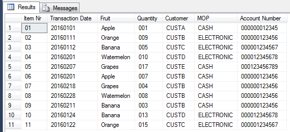 同样,可以通过技术演示更好地解释有关SQL Server主题的适当讨论。 因此,将用于生成SSRS和Excel报告的数据集将基于在我的文章《在SSIS中处理不正确的右格式的文件》中作为演示的一部分导入的虚拟数据。 出于本文的目的,我进一步转换了此数据,并以标题为FruitSalesSQL Server视图的形式表示了该数据。