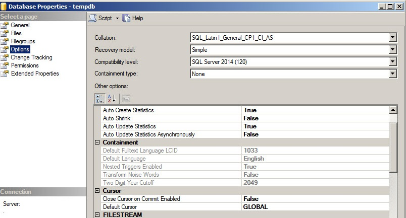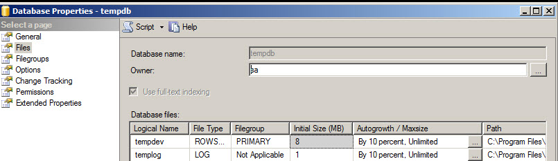 要检查tempdb的大小,请在SQL Server Management Studio(SSMS)中,转到“数据库”>“系统数据库”,然后右键单击tempdb数据库。 单击文件页面: