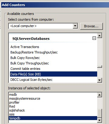 在系统监视中,选择“ SQLServer:数据库>数据文件的大小”,然后选择tempdb数据库。
