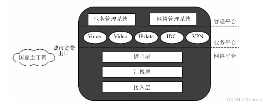 完整的宽带城域网主要包括网络平台、业务平台、管理平台3个平台与一个城市宽带出口。