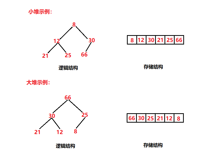 如果有一个关键码的集合,把它的所有元素按完全二叉树的顺序存储方式存储在一个一维数组中,孩子节点都不大于父节点的称为小堆,孩子节点都不大于其父节点的称为大堆