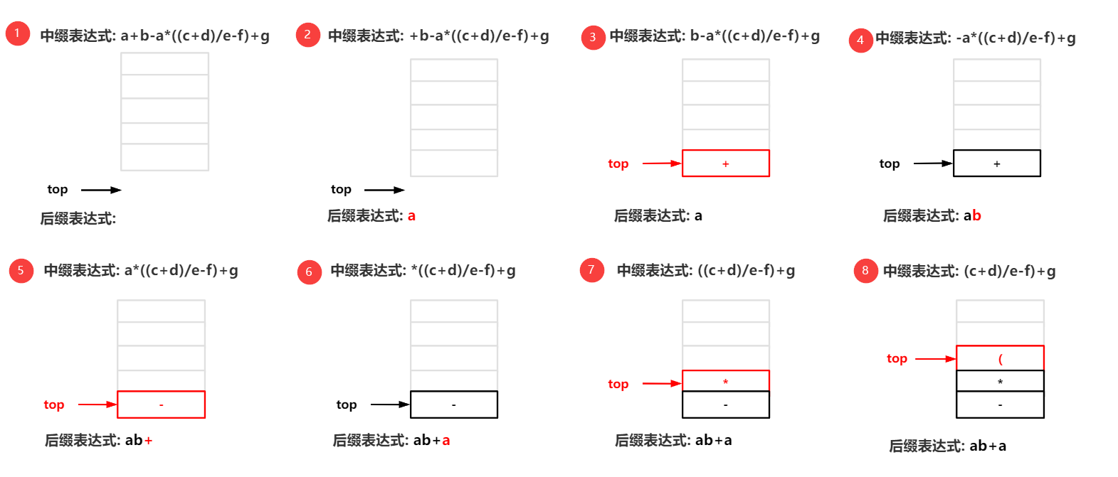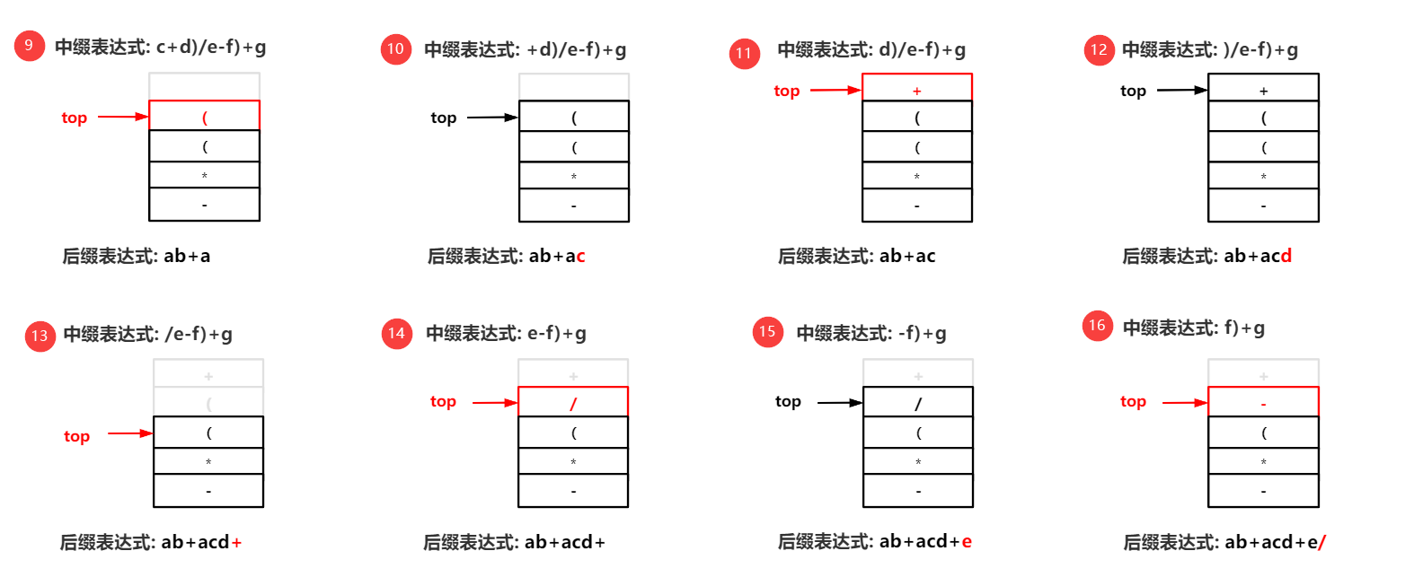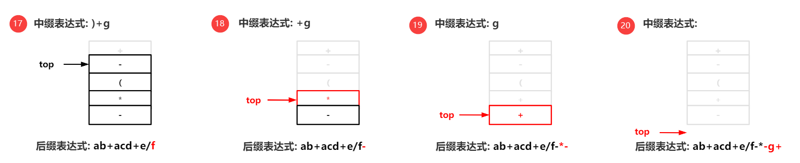③若为其他运算符,当其优先级高于栈顶运算符时,直接入栈;否则从栈顶开始依次弹出比当前处理运算符优先级高和优先级相当的运算符,直到一个比它优先级低或者遇到了一个左括号位置