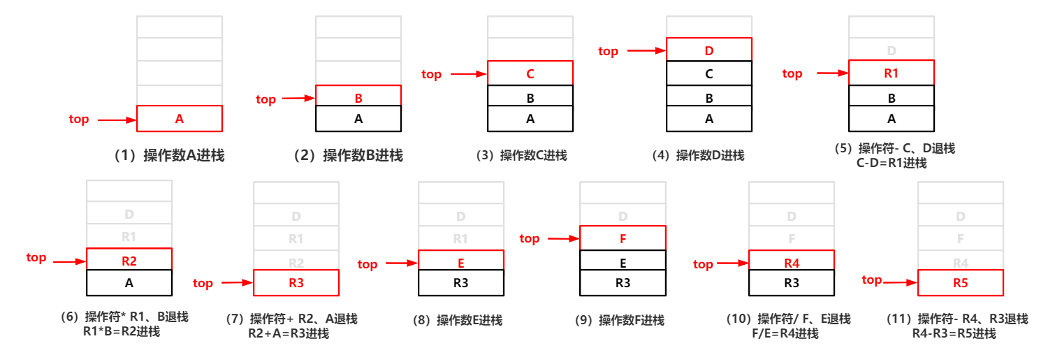 - 当表达式所有项都扫描并处理完后,栈顶存放的就是最后的计算结果