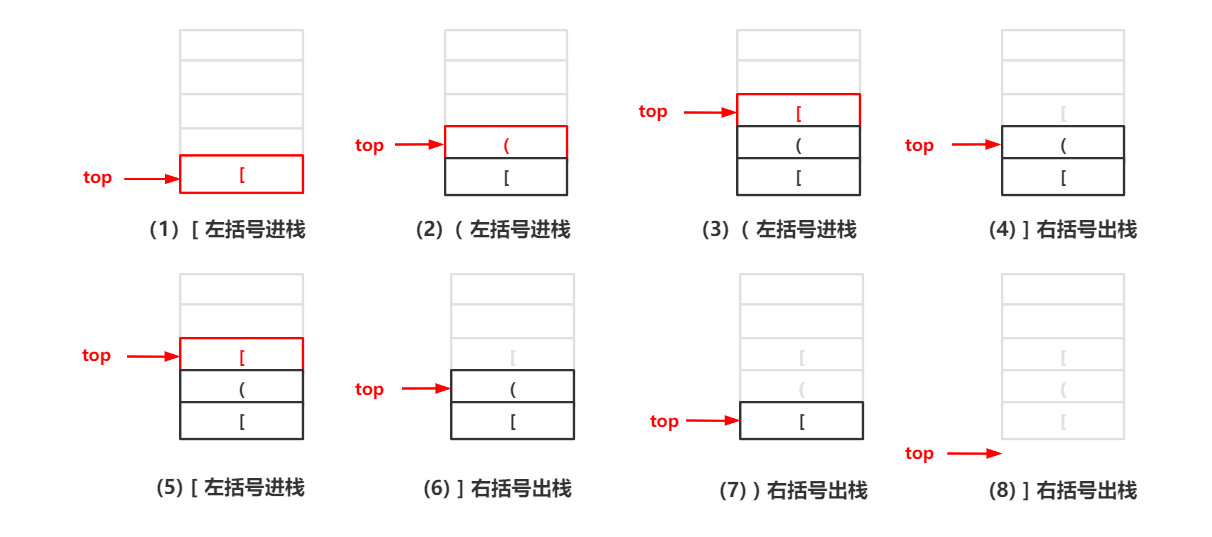- 若是右括号,则或者使置于栈顶的最急迫期待得以消解,或者是不合法的情况(括号序列不匹配,退出程序)