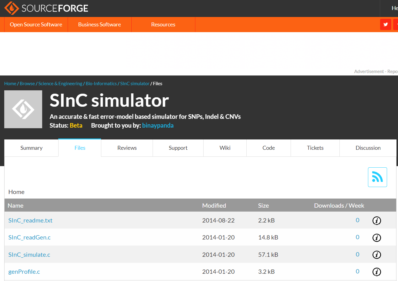 生物信息学仿真软件SInC的初步使用教程 1. 下载软件下载:https://sourceforge.net/projects/sincsimulator/paper: SInC: an accurate and fast error-model based simulator for SNPs, Indels and CNVs coupled with a read generator for short-read sequence data2. 使用SInC有三个部分,分别对应三个可执行文件2.1 genProfile 模拟测序质量