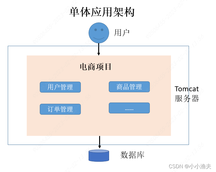当网站流量很小时,只需一个应用,将所有功能都部署在一起,运行在一个服务器上,以减少部署节点和成本。此时,用于简化增删改查工作量的数据访问框架(ORM)是关键。比如:到目前为止,就以电商为例,有用户模块、有商品模块、有订单模块等等诸多模块,那么项目在部署的时候,是将所有模块一起打包放置到运行服务器Tomcat去运行。这种传统的项目架构设计,就属于单一应用架构。如下图所示: