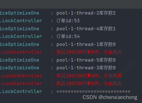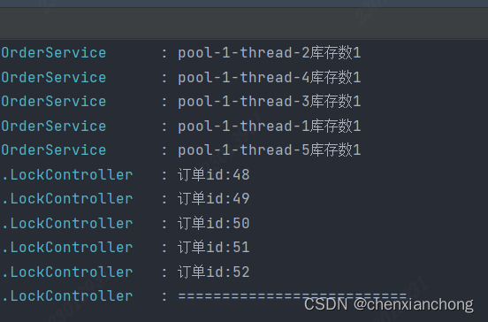 这是输出结果,可以看到,我们库存只有1个,但是下了五个单,这样就发生了超卖。解决超卖问题,我们需要使用锁