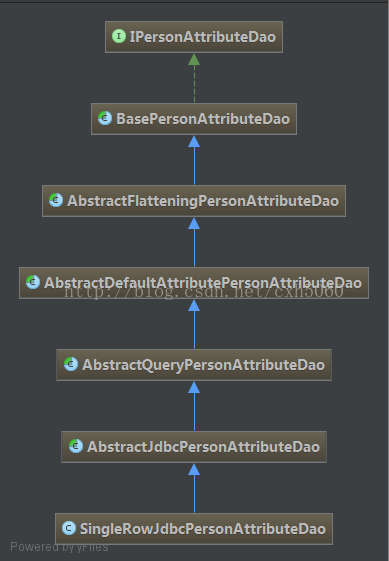 查看org.jasig.services.persondir.support.StubPersonAttributeDao的父类的子类可以发现下面的类org.jasig.services.persondir.support.jdbc.SingleRowJdbcPersonAttributeDao,其继承关系如下