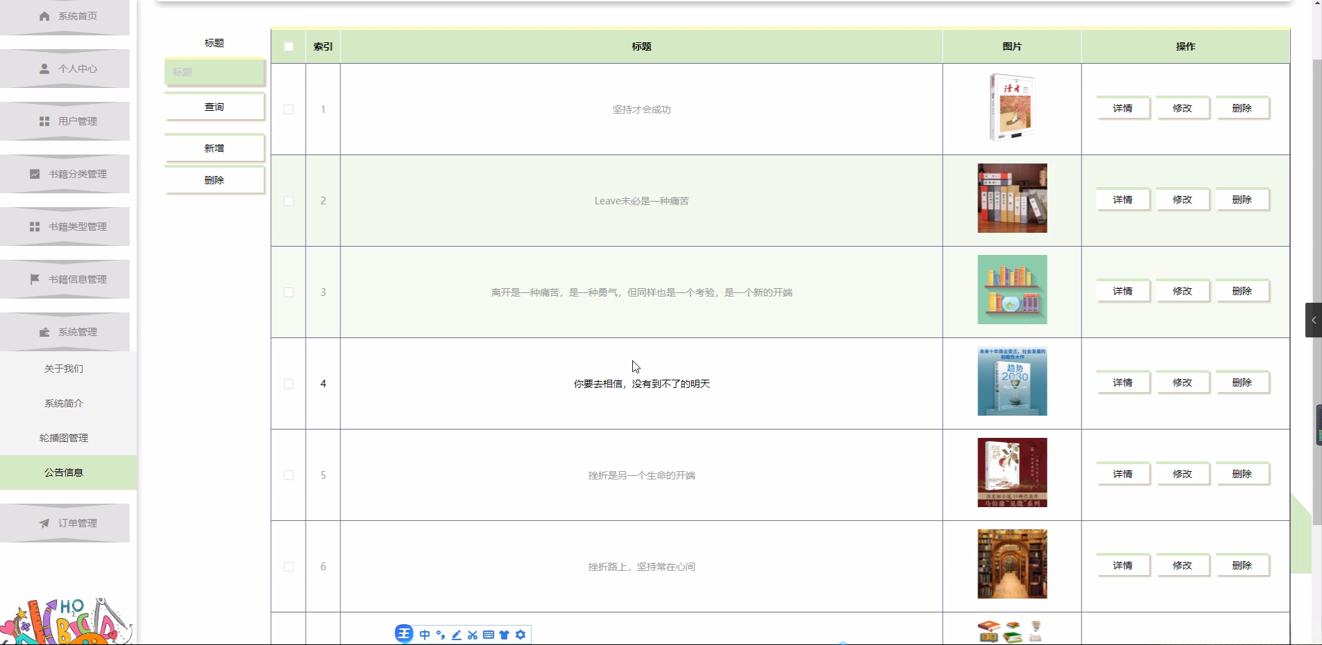 研究内容: 本研究的主要内容是根据系统功能需求进行迅读网上书城的设计与实现。系统功能包括用户管理、书籍分类管理、书籍信息管理和书籍类型管理等。用户管理模块主要包括用户的注册、登录、个人信息管理等功能;书籍分类管理模块主要包括书籍分类的添加、修改、删除等功能;书籍信息管理模块主要包括书籍信息的发布、修改、删除等功能;书籍类型管理模块主要包括书籍类型的添加、修改、删除等功能。通过这些功能,用户可以方便地进行用户信息的管理,浏览和选择不同类型的图书,进行图书的发布和修改等。