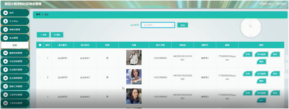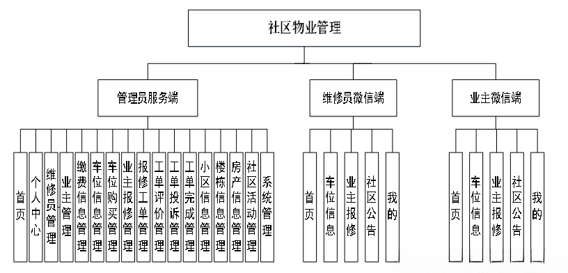 为了更好的去理清本系统整体思路,对该系统以结构图的形式表达出来,设计实现该社区物业管理的功能结构图如下所示:
