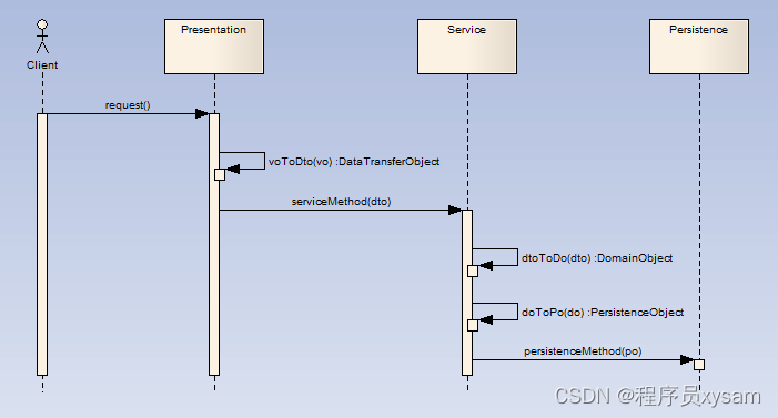 下面以一个时序图建立简单模型来描述上述对象在三层架构应用中的位置