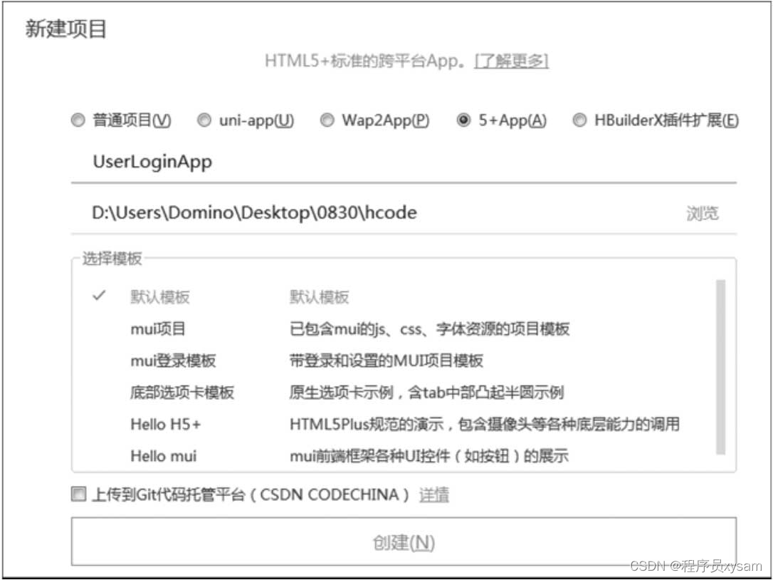 (3)使用HBuilder新建一个前台项目,项目类型为“5+App”(如图2-12所示)。