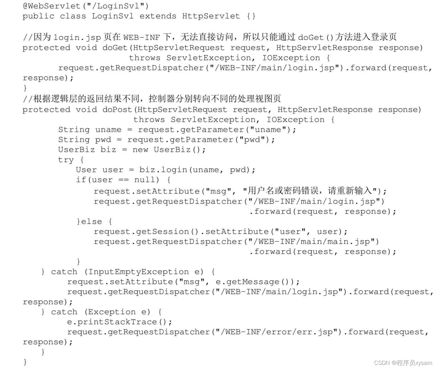 根据HTTP的请求方法GET/POST,在控制器中分别使用doGet()转到login.jsp页;使用doPost()方法处理客户端提交的请求信息。