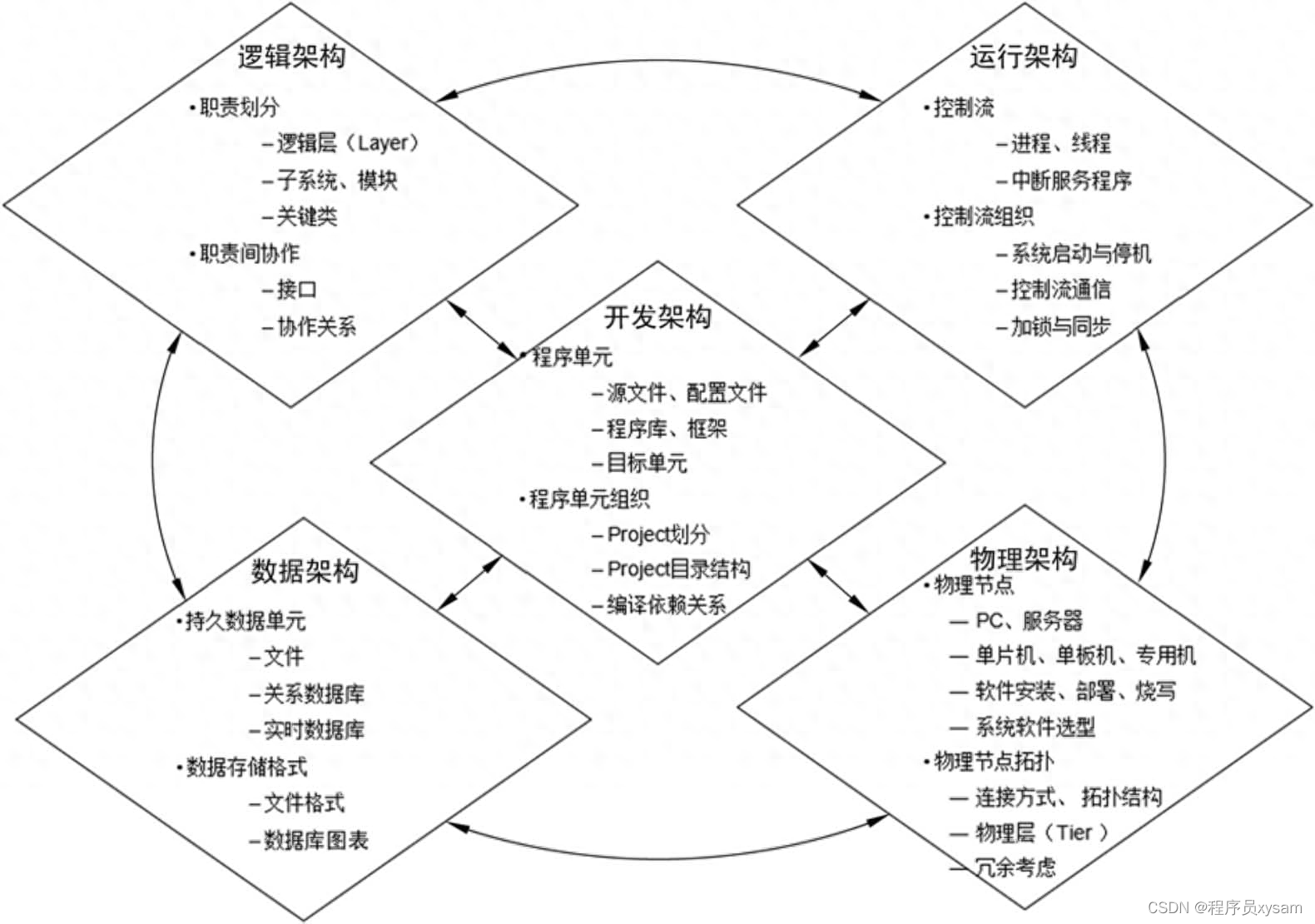 总体来说,软件架构是对软件系统从整体到部分的描述,从开发到运行再到后期扩展的描述,从性能到安全可靠性的描述等。