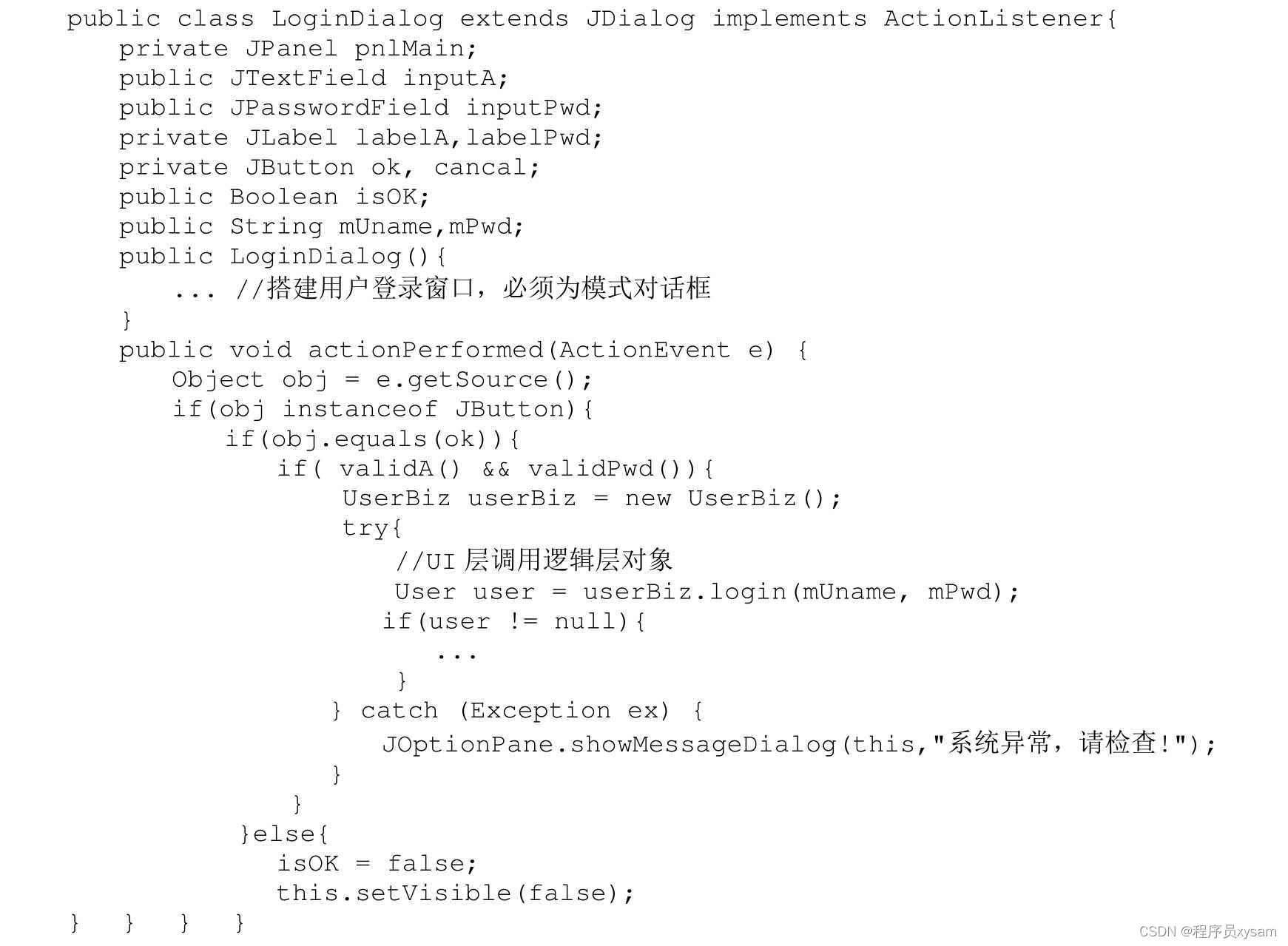 在模式对话框中,校验用户名、密码不为空后,在UI层调用服务层对象UserBiz,进行用户登录的逻辑校验。