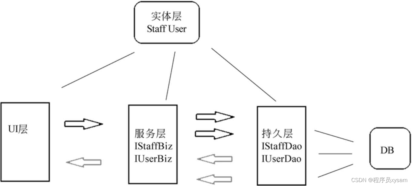 软件三层架构分为UI层、服务层(或称业务逻辑层)、持久层(注意:实体层对象用于跨层传递数据)。软件三层架构模式主要应用于桌面App系统,即早期的C/S系统的客户端程序使用三层架构模式,代码的可读性、可维护性有了很大的提升。
