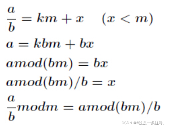 除法取余的特殊情况有一个公式,在b|a的前提下,即a%b == 0时,(a/b)%mod == a%(mod*b)/b,证明如下: