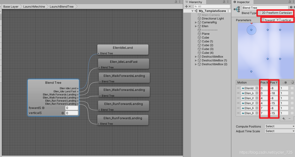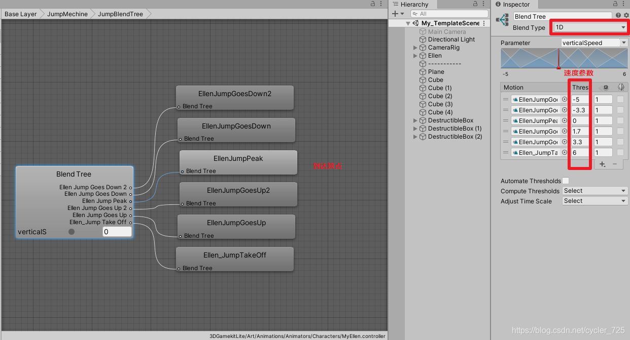PosY对应的落地(触碰到地表,但是速度还在减少的时候的速度),如果速度过大,会有更明显的缓冲动作。(这个当初调试很久,总是会出现高处落地时没有缓冲,低处落地有缓冲,所以速度要根据自己的参数来调试才行。