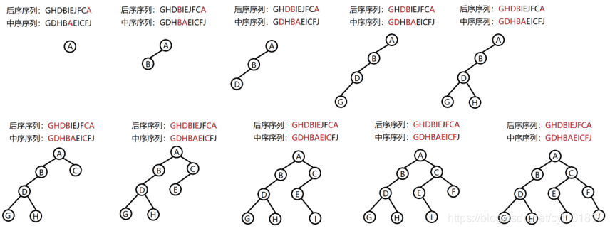 通过后序序列和中序序列逆推二叉树结构的方式和前面的通过先序序列和中序序列逆推二叉树结构的过程基本相似,只是现在确定子树树根节点的方式变成了:在后序序列中,最后出现的节点才是整个二叉树或者左右子树的树根节点。