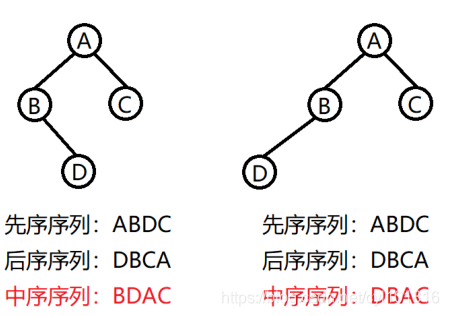 我们称图中两个二叉树结构下BD两个节点的结构为镜像对称。所以,如果在两个二叉树结构中存在这种进行对称的结构,是不能够通过先序序列和后序序列进行区分的,只能够再通过一个中序序列加以区分。