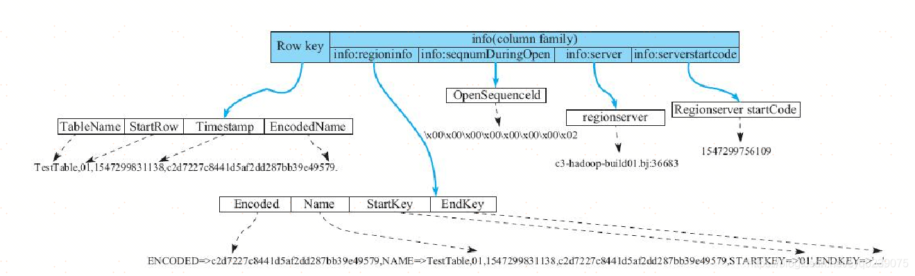 info:regioninfo:该列对应的Value主要存储4个信息,即EncodedName、RegionName、Region的StartRow、Region的StopRow。