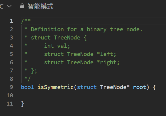 因为两棵子树要对称,因此最后一步递归传参时,我们不再是左跟左比、右跟右比,而是一棵树的左子树和另一棵树的右子树比,右子树与左子树比。改造封装好函数后,直接调用,将根结点的左右孩子传过去,便相当于传了两棵树的根结点,然后按照刚才的思路比对再返回函数的判断结果即可。