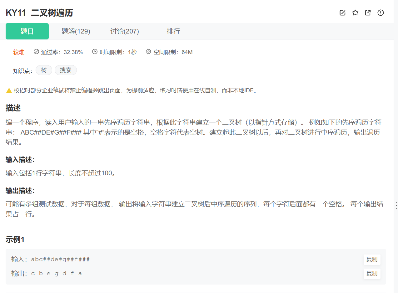 最后将main函数中接收到根结点的root传入中序遍历函数中即可,需要注意的是题目要求打印的每个字符之间需要留有空格,因此%c后面要有空格