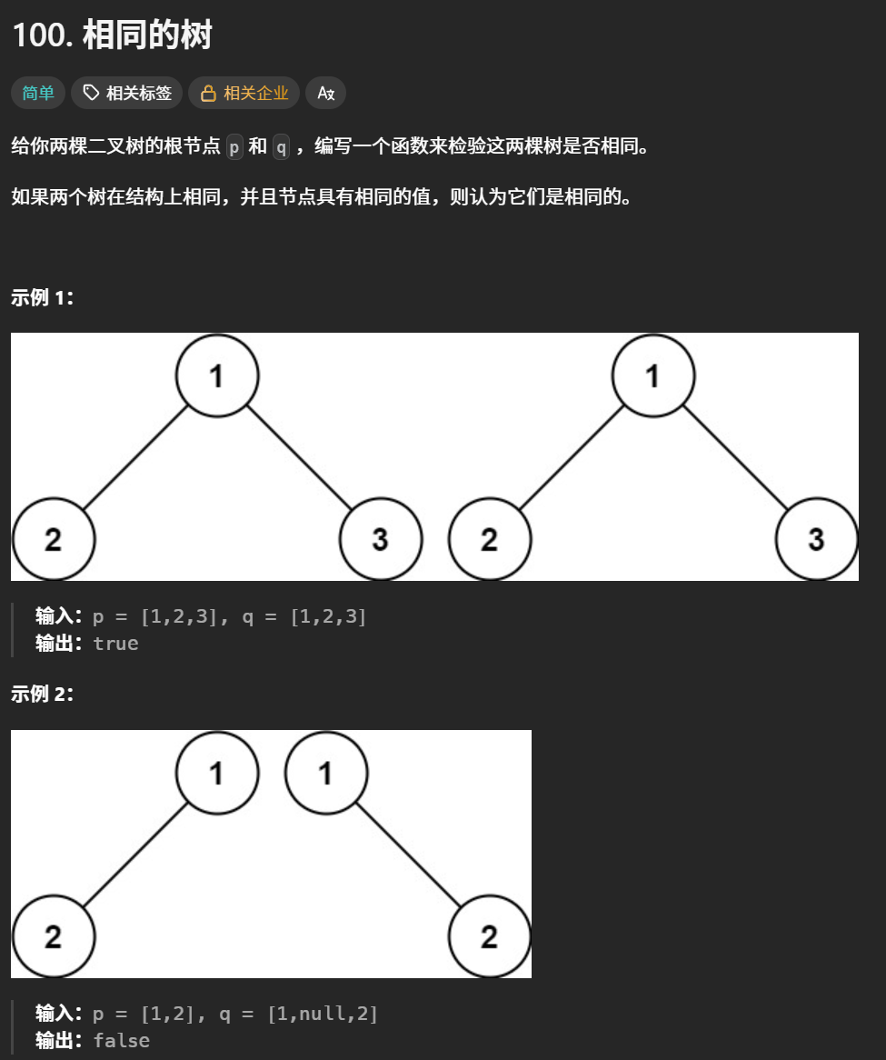要判断两棵树是否为相同的数,则需判断它们所有结点的结构和值是否相同,这里递归的底层逻辑就是判断两个结点的结构是否相同(是否要么均为空要么均不为空)和值是否相同,然后再分别向左右子树递归,判断所有结点,左子树跟左子树比,右子树跟右子树比。只要存在一处地方不同,则直接返回false,全相同才为true。