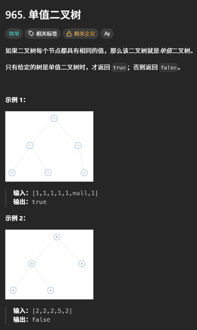 判断二叉树中所有结点的值是否为同一个值,最底层的递归逻辑就是根结点的值与左右结点的值是否一致,当然还得考虑根结点为空的情况,这也是递归的终止条件,如果根结点为NULL,那不存在任何值,当然也算单值,则返回true。除此之外,还需单独比较根结点与左右孩子的值,但前提是左右孩子不为空。如果与左右孩子任意一个的值不一致,则直接返回false;如果均一致,则继续向下递归。递归完所有结点(左右子树)后均未出现false,则证明二叉树为单值二叉树。