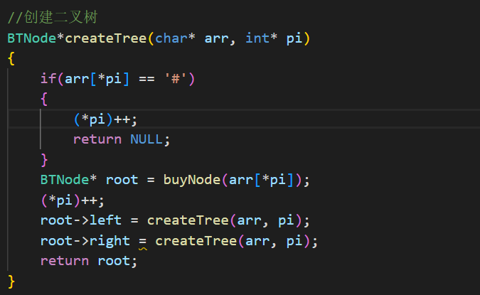 题目告诉我们'#'代表空格表示空树,因此当我们对数组遍历时遍历到该符号就无需创建结点,直接返回NULL即可,但是返回前记得让下标前进,即(*pi)++,否则无法继续遍历。遍历到其他字符时,便可以创建结点,将字符传参入申请结点的函数buyNode(申请结点的函数这里不单独展示了),并用root接收新创建的结点。由于题目说字符串是由二叉树前序遍历而来,因此我们先给根结点创建,再分别对左右子树递归创建结点,分别用root的左右孩子接收,最后字符串遍历结束,二叉树也创建完成,返回根结点。
