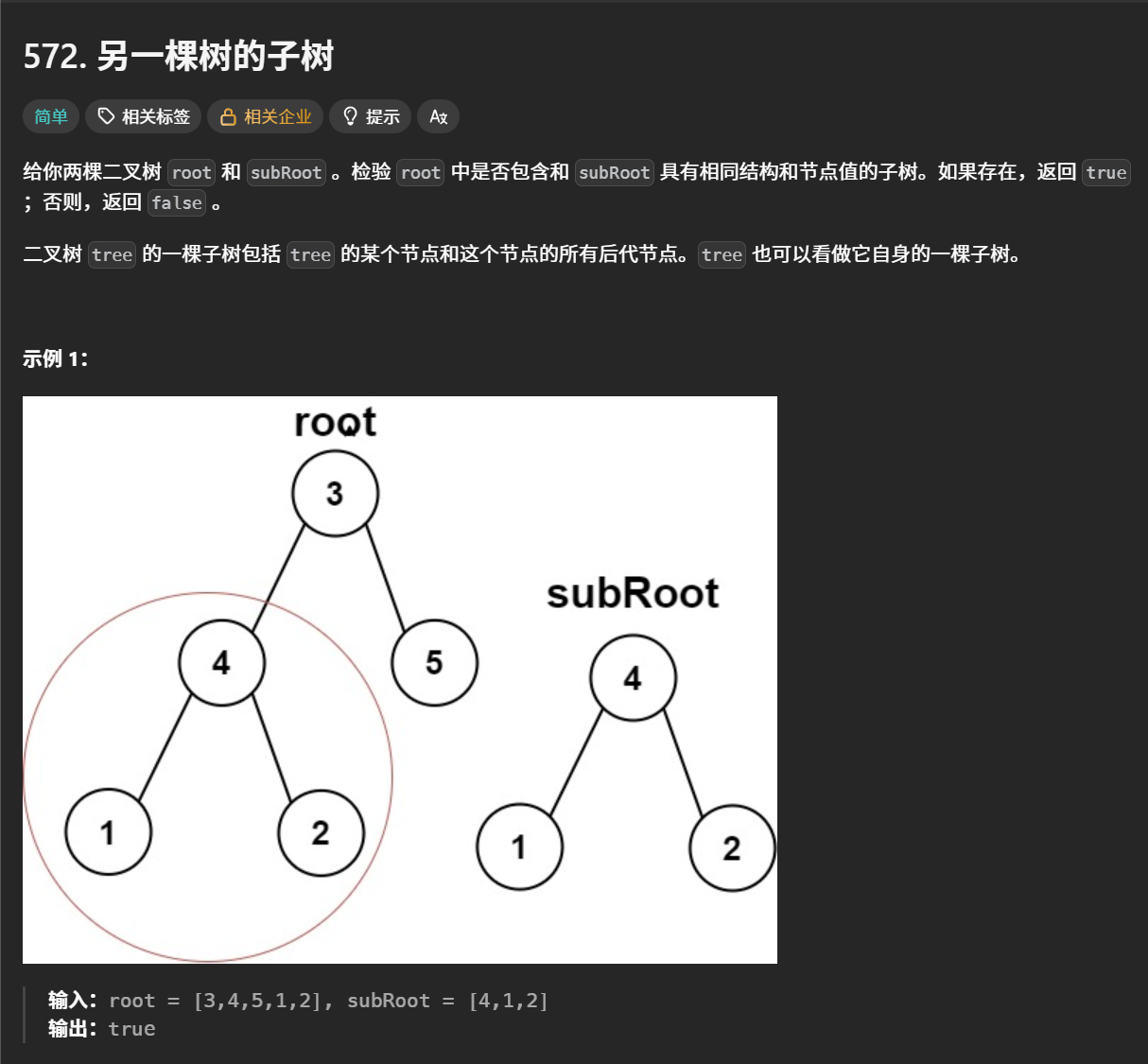 要从一棵树中寻找与subRoot相同的树,本质上也是找相同的树,首先判断root是否为空,如果为空则直接返回false,因为空树不可能存在子树与subRoot相同。如果不为空,该题递归的底层逻辑就是将根结点root和subRoot传参到判断“相同的树”的函数isSameTree中(前面有代码实现了),如果这个root结点传过去后返回true则证明存在与subRoot相同的子树,如果返回false,则继续往左右子树向下递归,再继续传参匹配,直到出现可以匹配的子树(只要左右子树任意位置存在可与之匹配的子树即可)。