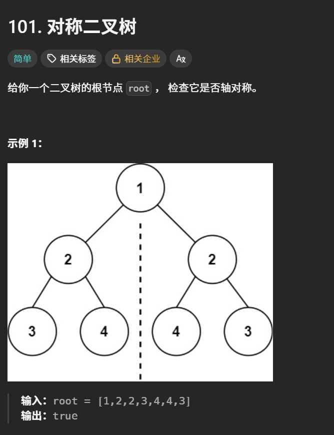 本题解题方法与上一题“相同的树”有异曲同工之处,想要判断二叉树是否为对称二叉树,不必理会根结点,只需要判断左右子树是否对称即可,可以把左右子树看出两棵单独存在的树,上一题判断两棵树是否相同的方法就是在结构和数值上左子树跟左子树比、右子树跟右子树比,这题稍微有点变化