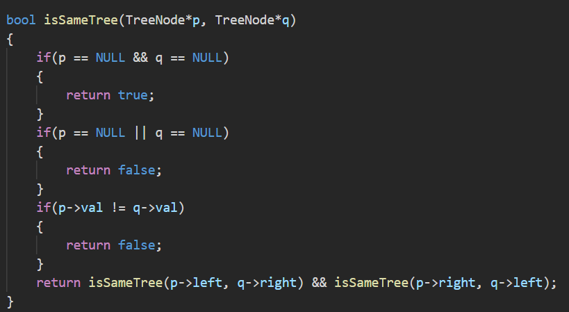 return isSameTree(p->left, q->left) && isSameTree(p->right, q->right);