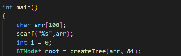 首先在main函数里面创建好数组,由于题目已经告诉我们输入的字符串长度不超过100,因此我们创建静态数组给定100的空间即可,创建下标变量i,传入构建二叉树的函数createTree,并用root接收根结点。