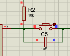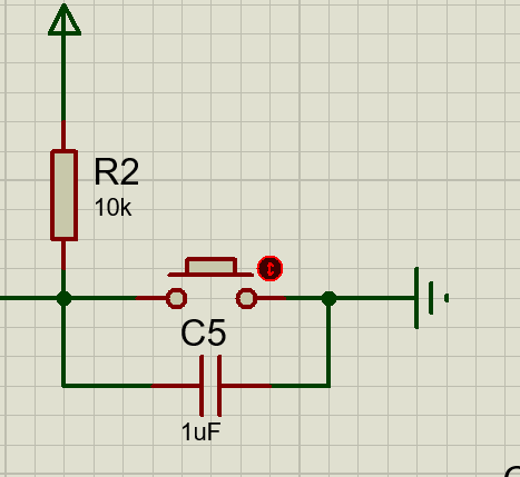 再拿出来一个电容,防止我们松开按键时候,端口立马变为高电平,给端口一个大脉冲,所以接入一个电容,进行滤除这个大脉冲。电容阻值我们上面计算过,为1uF。