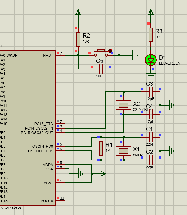 ,同时通过一个100nF的电容接地以实现上电复位。一个常开按键并联在电容两端,当按键按下时,NRST